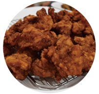 鶏、豚、牛のひき肉にタマネギを加えて丸め、パン粉を付けてじっくり揚げ、仕上げには特製のたれをたっぷりと。